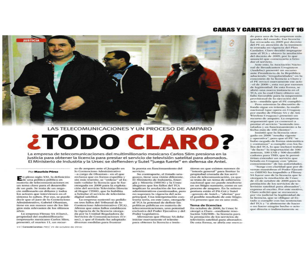 DENUNCIA DE SUTEL ANTE LA ACCIÓN DE AMPARO DE CLARO La empresa Flimay s.a. (perteneciente al conjunto económico CLARO) presentó una acción de amparo contra Poder Ejecutivo- MIEM y Presidencia …