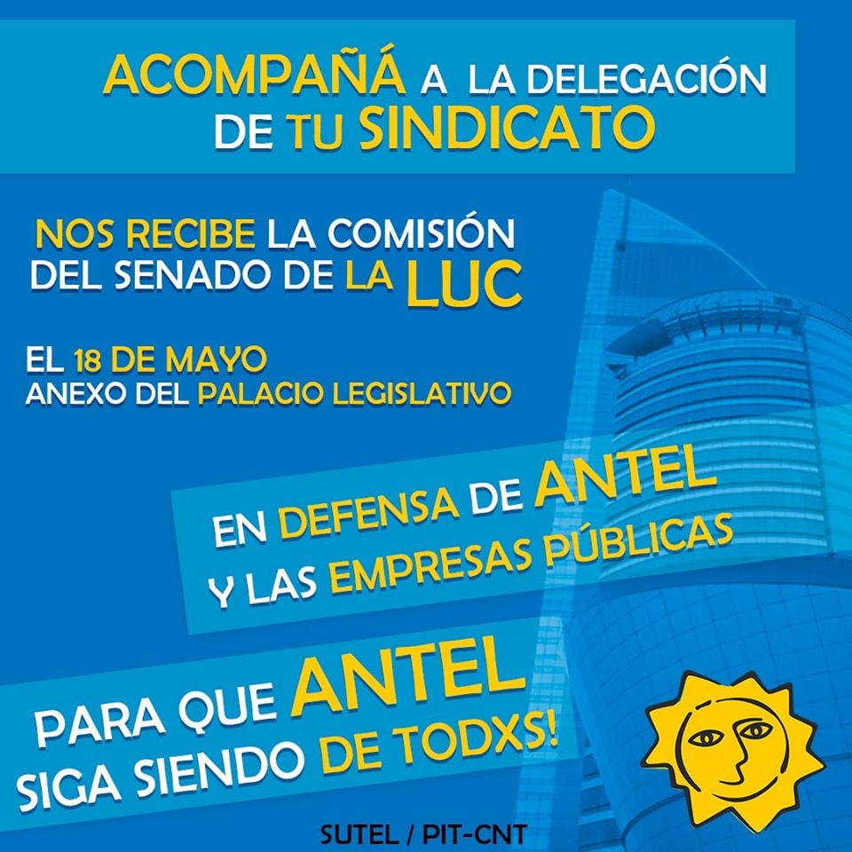Compañeros/as: El próximo 18 de mayo a las 16:30, la Comisión del Senado que trata la LUC recibe a nuestro sindicato. Convocamos a acompañar a la delegación de SUTEL en el Anexo …