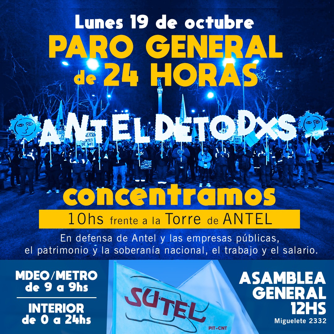 Lunes 19 de Octubre PARO GENERAL DE 24HS. Concentramos a las 10hs en Torre de ANTEL. En defensa de ANTEL y las Empresas Públicas, el Patrimonio y la Soberanía, …