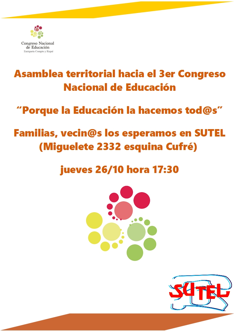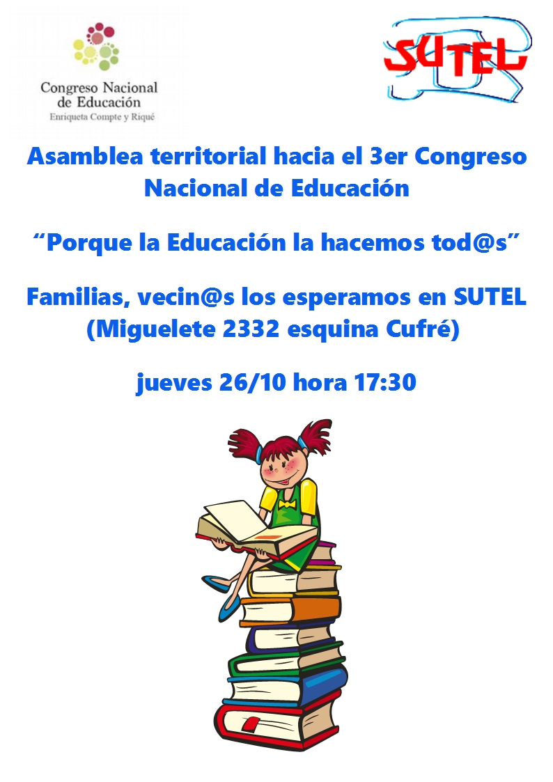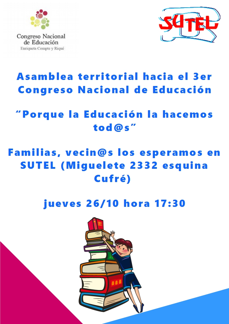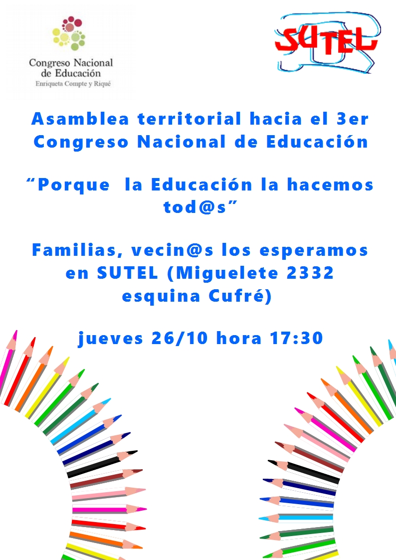 SUTEL (Sindicato de trabajadores/as de Antel) invita a familias, vecinos/as, trabajadores/as y la comunidad toda a la Asamblea Territorial hacia el 3er Congreso Nacional de Educación a realizarse el jueves 26/10, hora 17:30 en nuestro complejo de la calle Miguelete 2332.