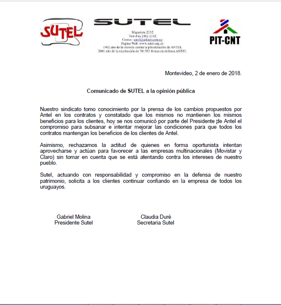 Comunicado de Sutel a la opinión Publica Públicado en enero 2, 2018enero 2, 2018 por Ivan Padula Comunicado a la opinión pública – Sutel