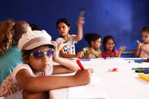 Además de Arte, los niños pasan su tiempo entre Literatura, Ajedrez y Música. En este último es difícil mantenerse sentado: la música de la guitarra del profesor sonaba alto en el patio techado. A pesar de la sombra, el calor ya se sentía sobre las 11.00, pero a algunos niños de ocho y nueve años no les importó y se dedicaban a saltar. La misión del día consistía en que cada subgrupo de cuatro o cinco niños dijera el siguiente verso de la estrofa que comenzaba con “la lluvia viene bien”. Las respuestas caían como gotas, la inspiración no era tanta cuando faltaba tan poco para irse a comer, pero algunos de los grupos que permanecían sentados lograron terminar la canción con ideas como “hace crecer las flores”, “ayuda al charco” y “nos refresca”.