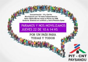 Además del paro de 9 a 13hs. en Montevideo y zona metropolitana. Cada plenario del interior realizará el paro en el horario más conveniente a la zona.