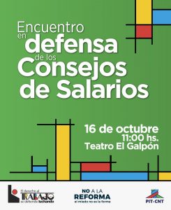 Este miércoles 16 de octubre de 11 a 13 hs se realizara una actividad en el Teatro el Galpón en el marco de la campaña del Pit Cnt en Defensa de los Consejos de Salario, por lo que convocamos a los Delegados de Montevideo y Área Metropolita a participar de la misma. Aquellos compañeros que participen lo podrán hacer con licencia gremial.
