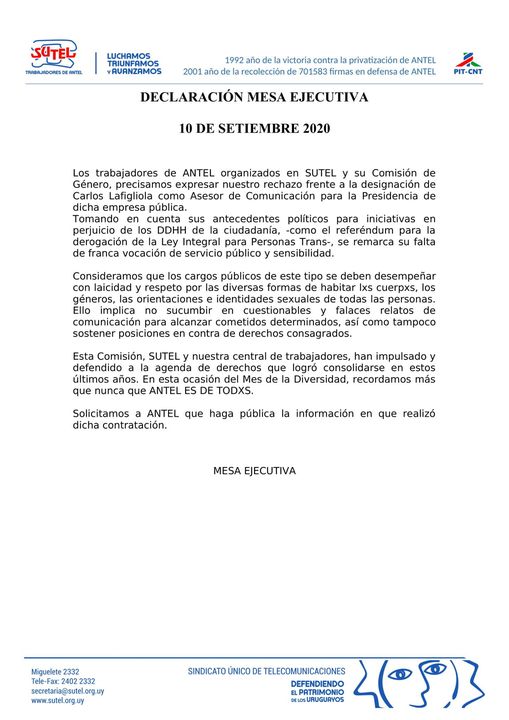 DECLARACIÓN MESA EJECUTIVA 10 DE SETIEMBRE 2020 Públicado en septiembre 10, 2020septiembre 11, 2020 por Ivan Padula