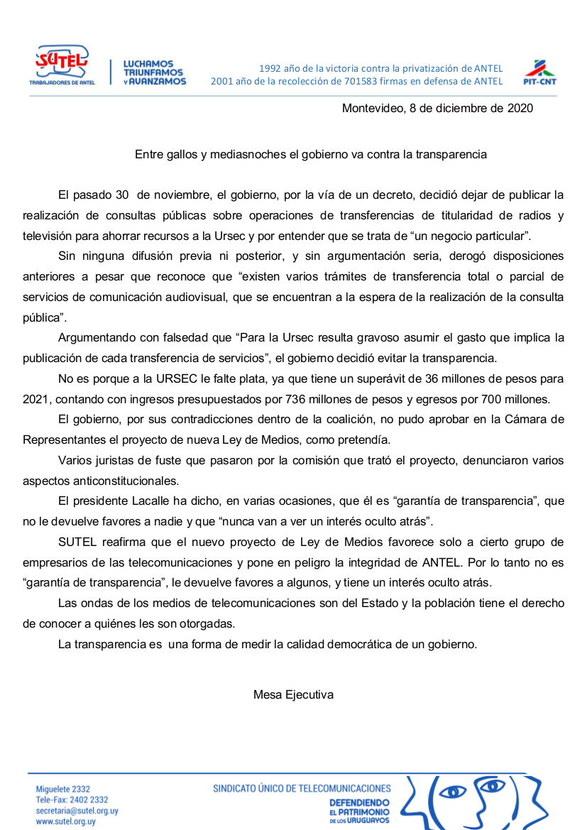 Comunicado de la Mesa Ejecutiva – 8 de diciembre 2020 Públicado en diciembre 8, 2020diciembre 8, 2020 por Ivan Padula
