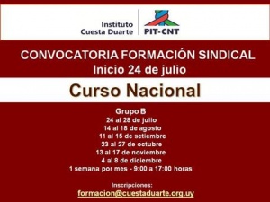Nuestro sindicato cuenta con algunos cupos para realizar este curso en el Instituto Cuesta Duarte, por sus características estamos convocando a integrantes de la Mesa Ejecutiva, delegados que hicieron el curso Formación Sindical en Sutel (“profundización”) o compañeros que participen en comisiones del sindicato o de la Central y que vivan en la zona metropolitana (ya que no está previsto pago de pasajes y hotel); además como es una carga horaria importante deben evaluar si pueden asistir (se puede hacer uso de licencia gremial)