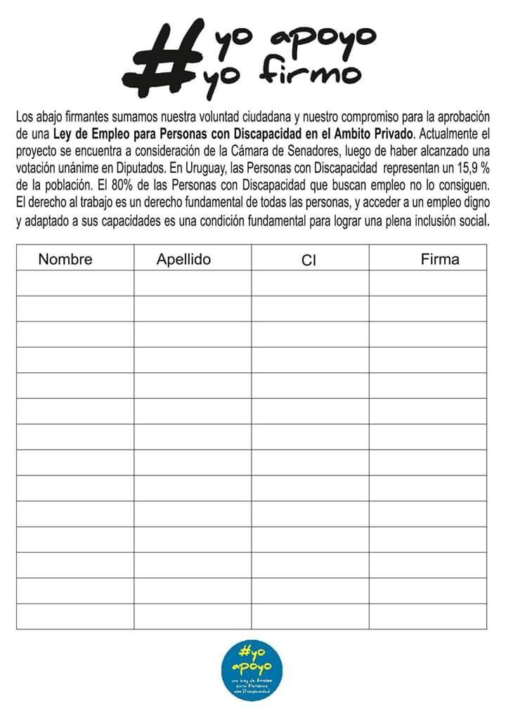 Iniciamos una campaña nacional de recolección de firmas para reafirmar la voluntad del pueblo urugayo en la aprobacion de la Ley de Empleo para Personas con Discapacidad y exigir que se apruebe en senadores.